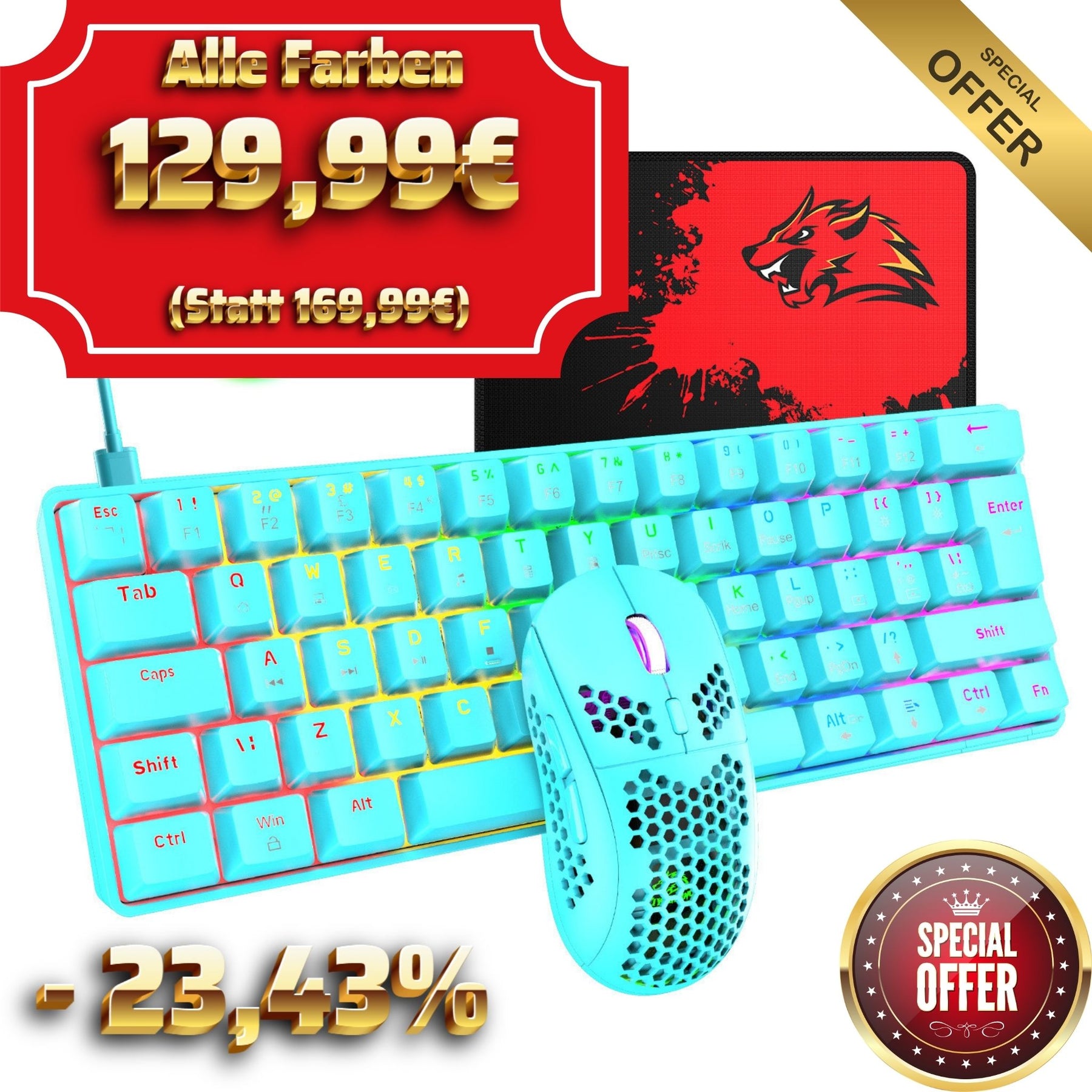 Das Gaming-Zimmer to go! Verwandle dein Tablet oder Notebook in eine echte Gaming-Station. Tastatur und Maus im Set, mit vollem RGB-Vibe und einfacher Verbindung. Dein kompaktes Setup für den Sieg.